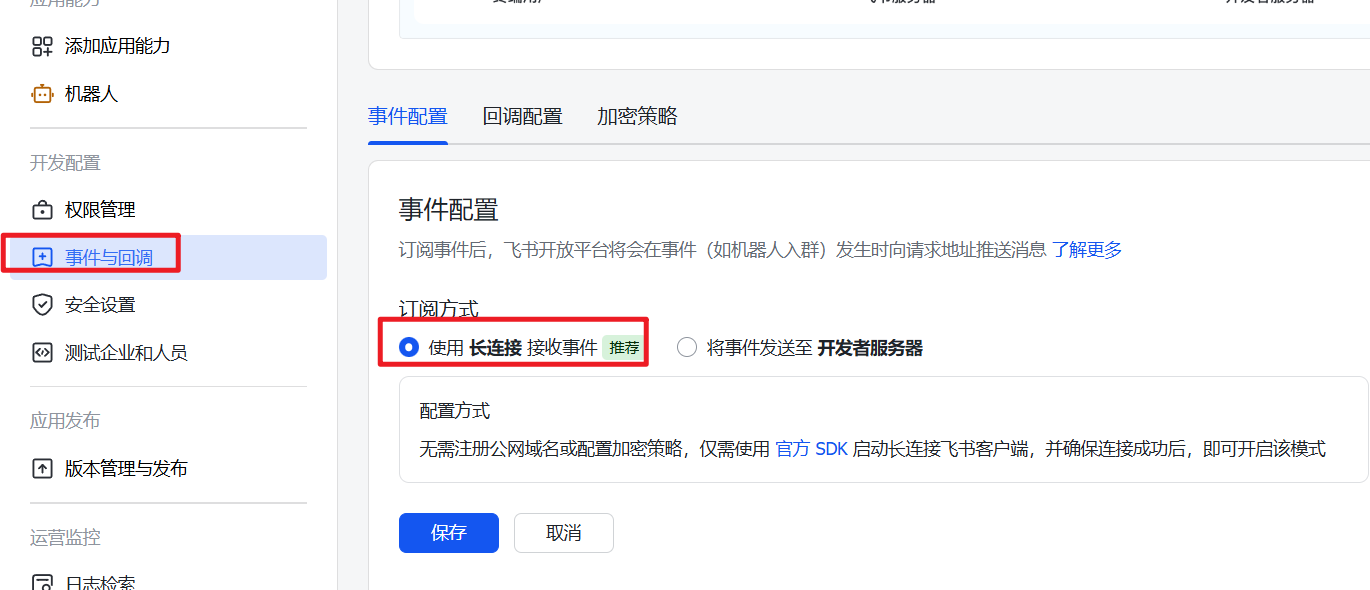 1、成功运行项目后,点击 事件与回调,选择长连接方式,点击保存。