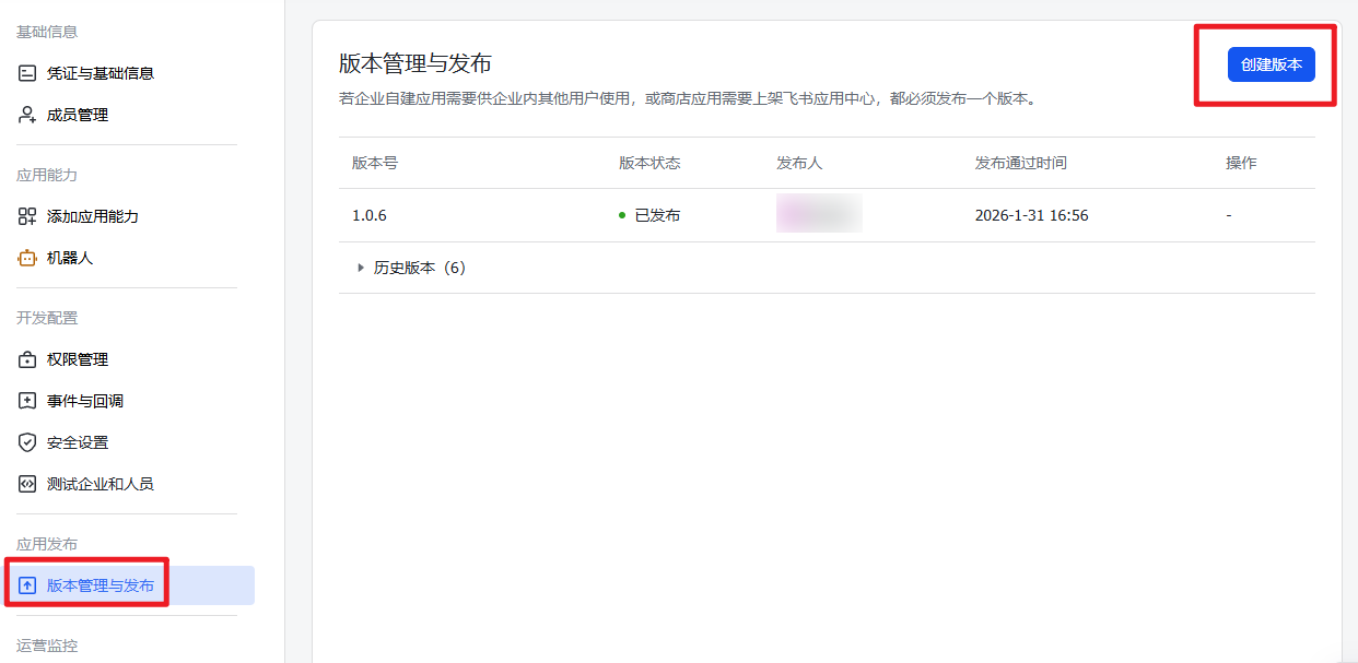 3、需要点击版本管理与发布,点击创建版本,并申请线上发布,在飞书客户端查看审批消息,并审核通过。