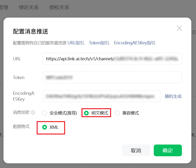 将LinkAI平台生成的 URL 链接填入 “URL”;将1.2中填写的令牌(Token)填入 “Token”;“消息加解密方式” 选择 明文模式: