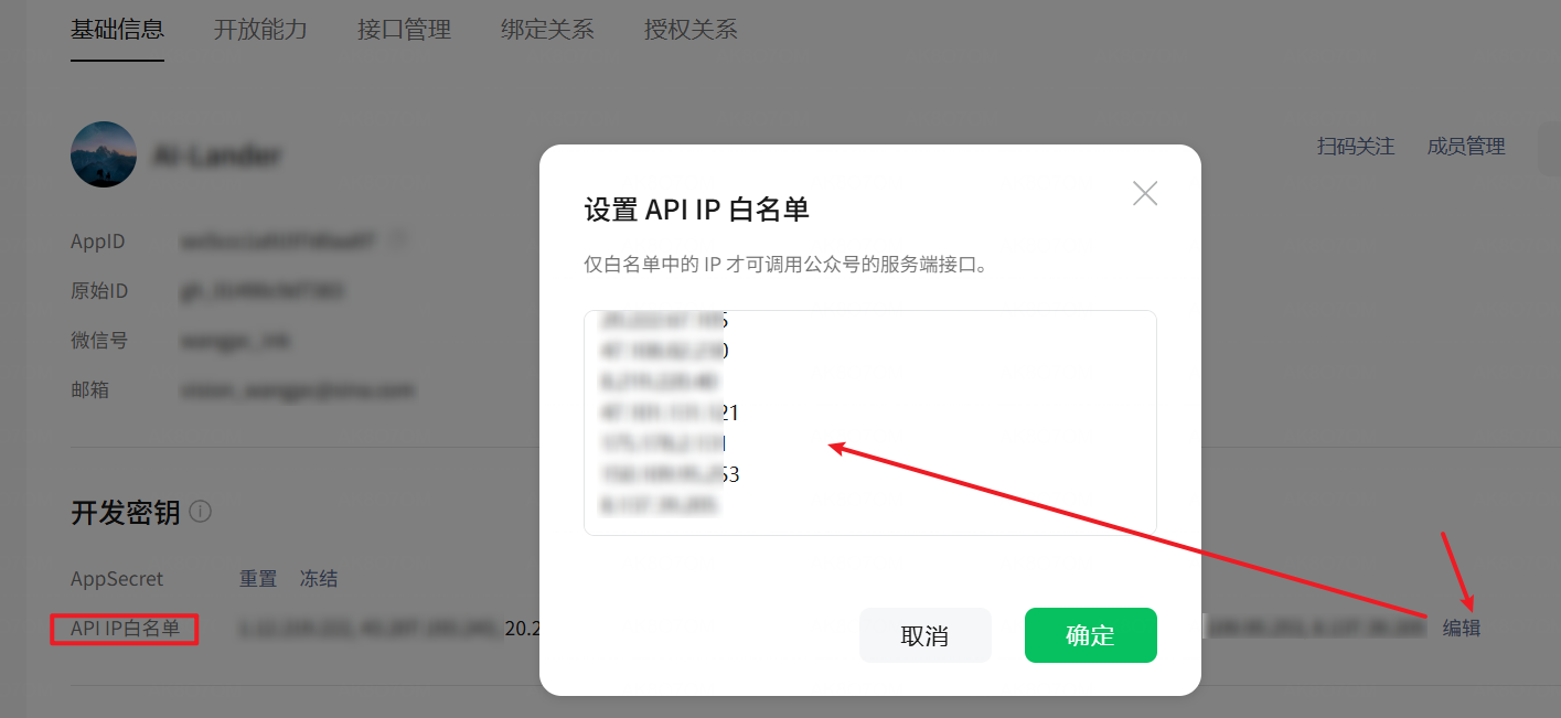在上一个页面的"开发密钥"配置中,编辑"API IP白名单",将LinkAI平台创建客户端第三步时生成的IP地址填入: