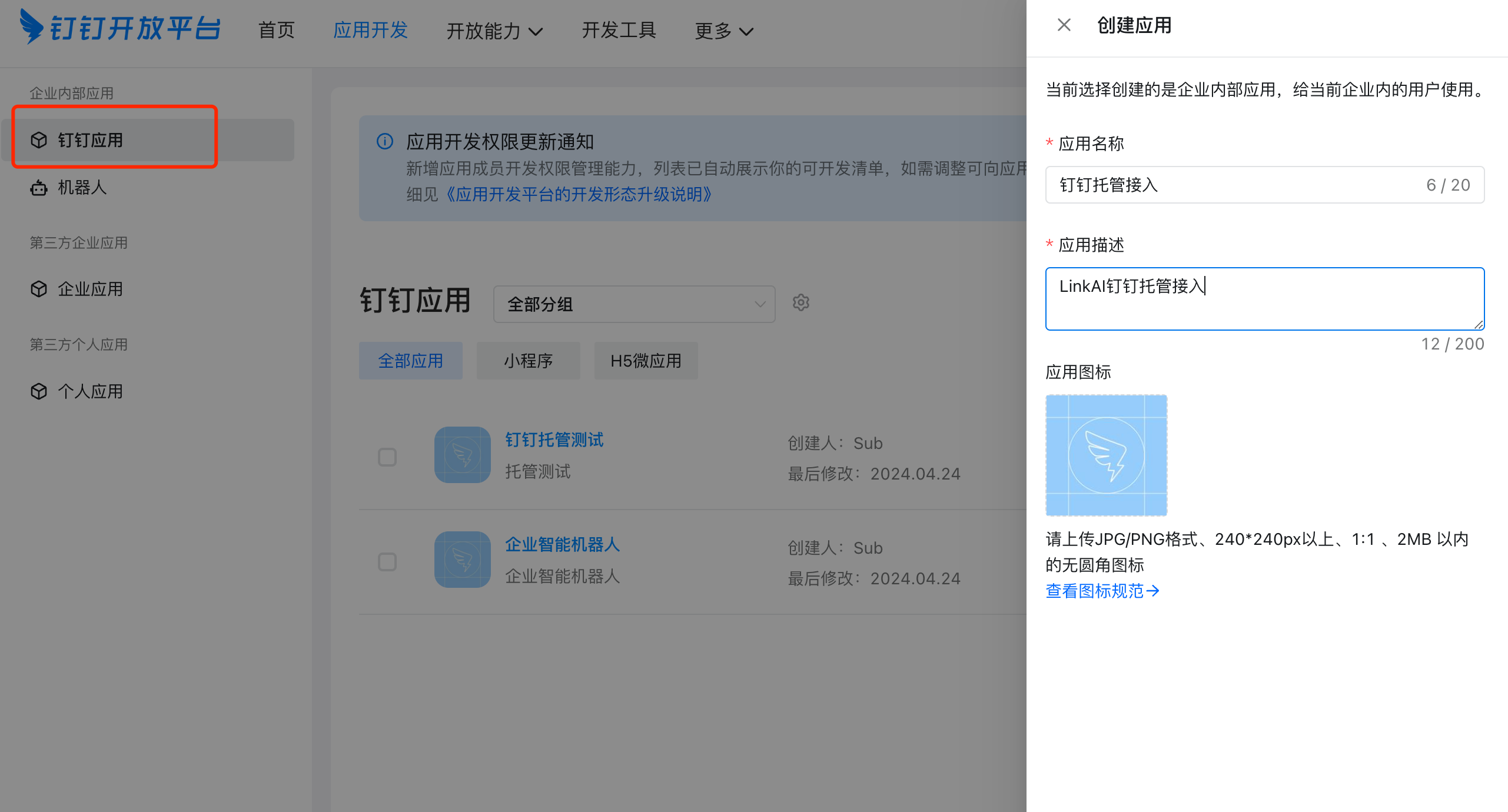 1.1 进入钉钉开发者后台,登录后,点击创建应用,填写应用相关信息。