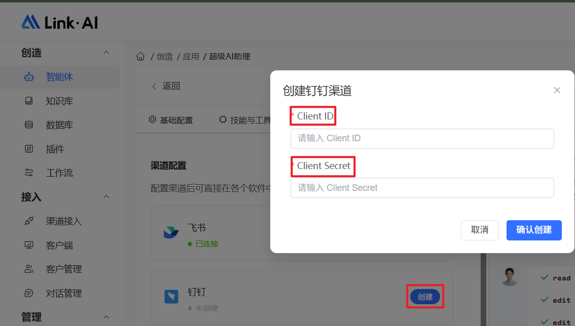 在 超级AI助理-渠道接入 界面找到 【钉钉】 渠道,点击 "创建",并把2.1步骤获取到的Client ID、Client Secret填到对应位置,最后点击 确认创建。