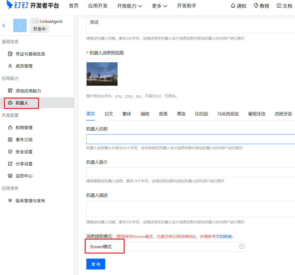 参考下图填写机器人相关配置信息,并选择 Stream模式,最后点击 发布