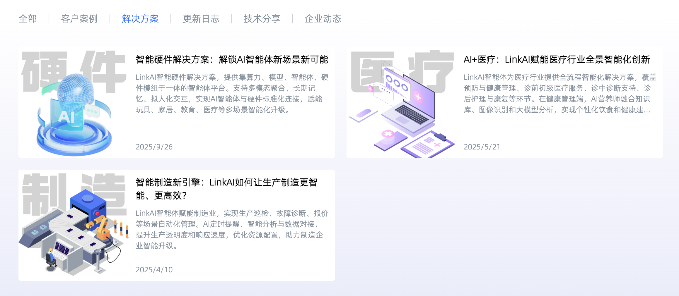 LinkAI目前已在AI客服、私域运营、企业数字员工、AI硬件等场景积累了丰富的解决方案,在消费、健康、教育、文旅、科技制造等各行业沉淀了大模型落地应用的最佳实践,平台通过智能体模板、行业解决方案、客户案例的形式将这些经验进行输出,为客户提供可借鉴可复用的智能化应用指南。