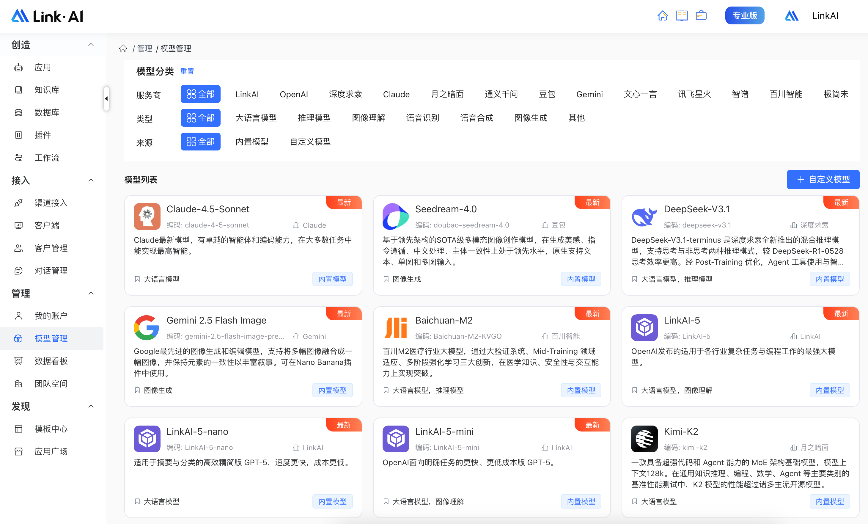 新增的模型管理模块,聚合了国内外多种厂商、多种模态的主流模型,同时可以创建自定义模型,将自有厂商模型或本地大模型接入智能体使用。所有模型以统一API接口对外提供,支持多种模型复杂均衡、故障转移,提供了高可用、高并发的MaaS服务。