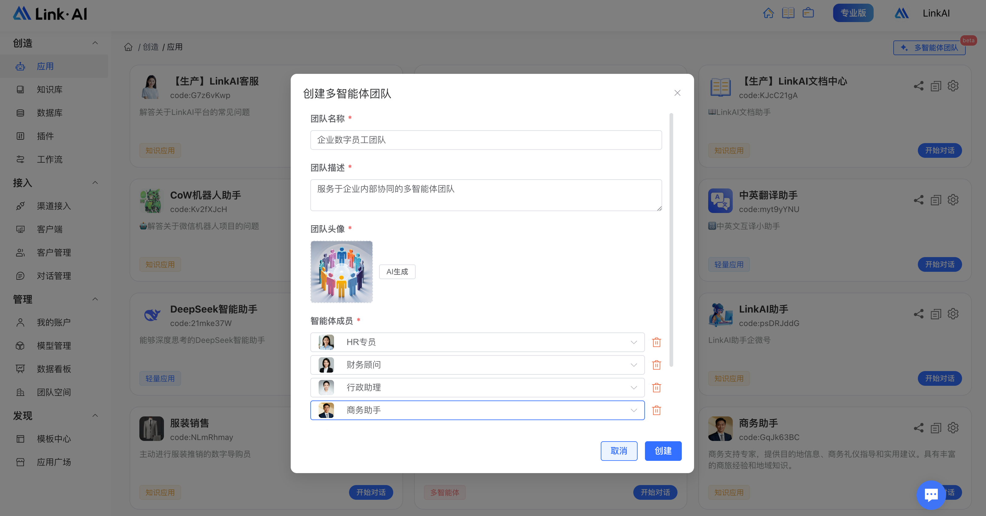 新增 多智能体团队 创建,可以将已有的 应用 或 工作流 作为成员加入团队,每个智能体可设置独立的模型、提示词、插件、知识库,并且拥有自身和团队的上下文记忆,可以快速搭建自定义的数字员工团队: