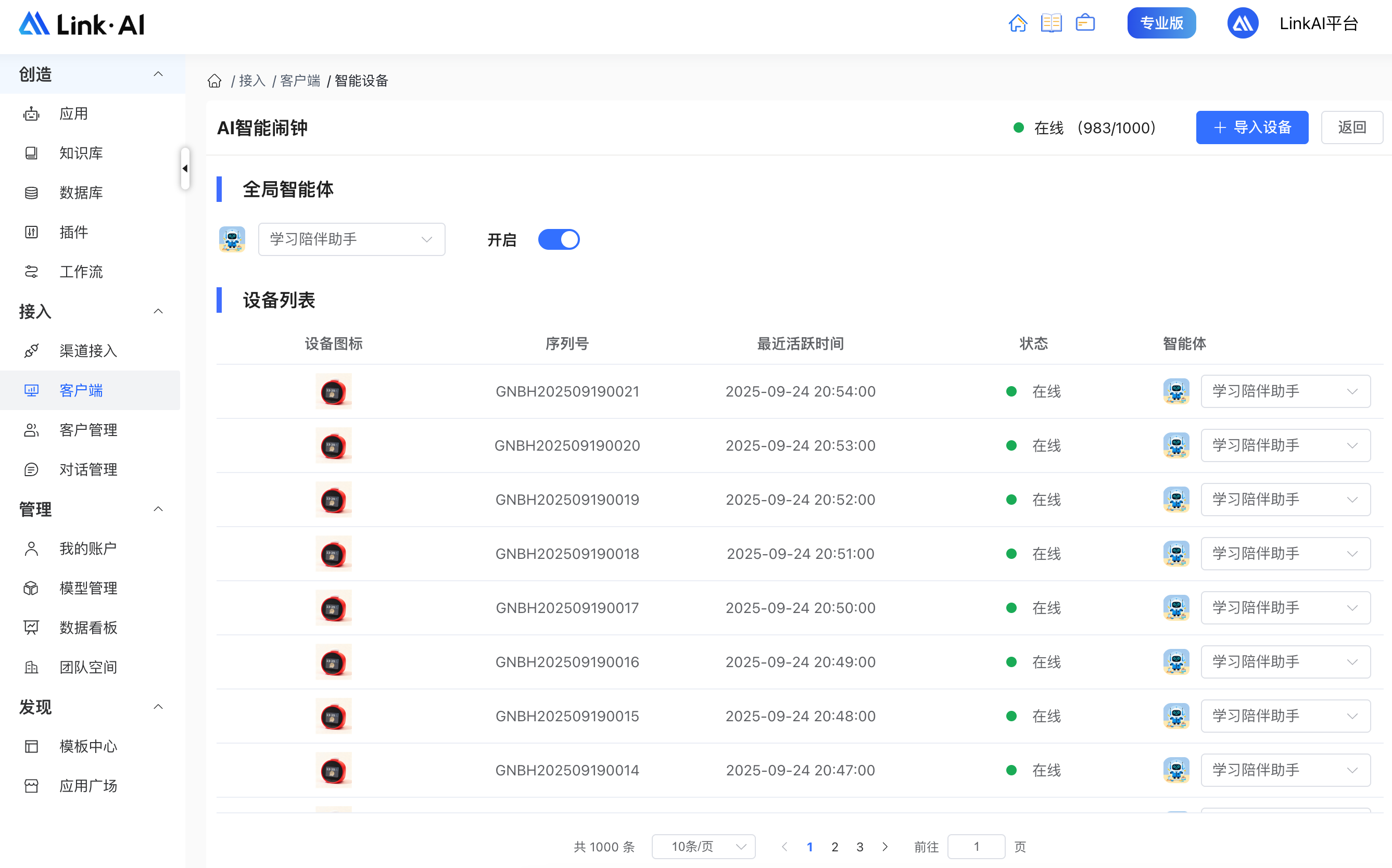 设备管理: 同时还提供了完善的设备管理功能,支持创建硬件产品,在产品下可以批量导入设备序列号,并支持在产品及单个设备维度灵活切换智能体绑定: