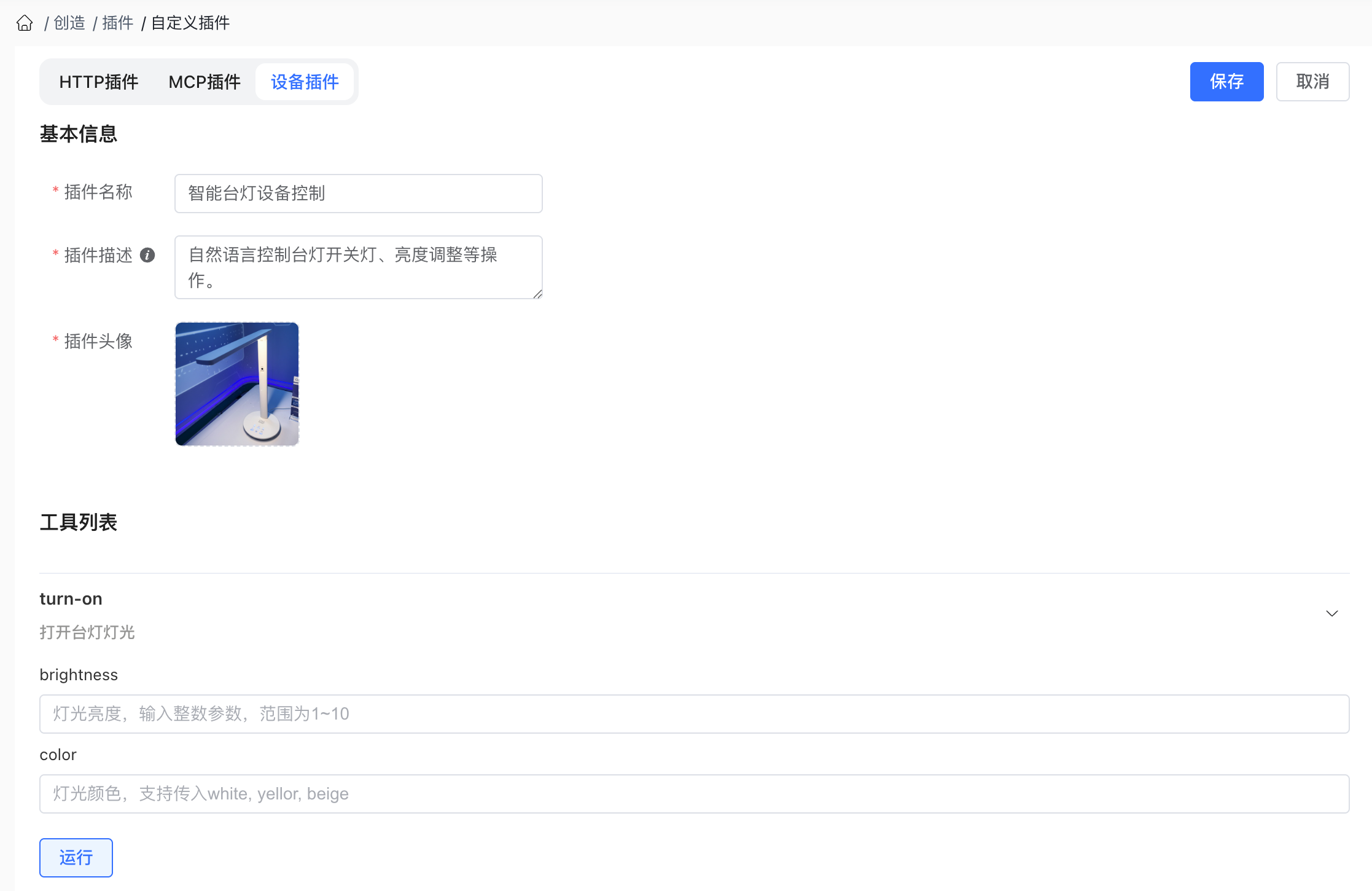 设备插件: 支持配置设备插件,用于绑定设备的实际动作。设备插件兼容MCP协议,在一个插件下可配置多个子工具,用户交互时通过自然语言进行插件的决策和触发,并在设备端完成实际操作的执行。