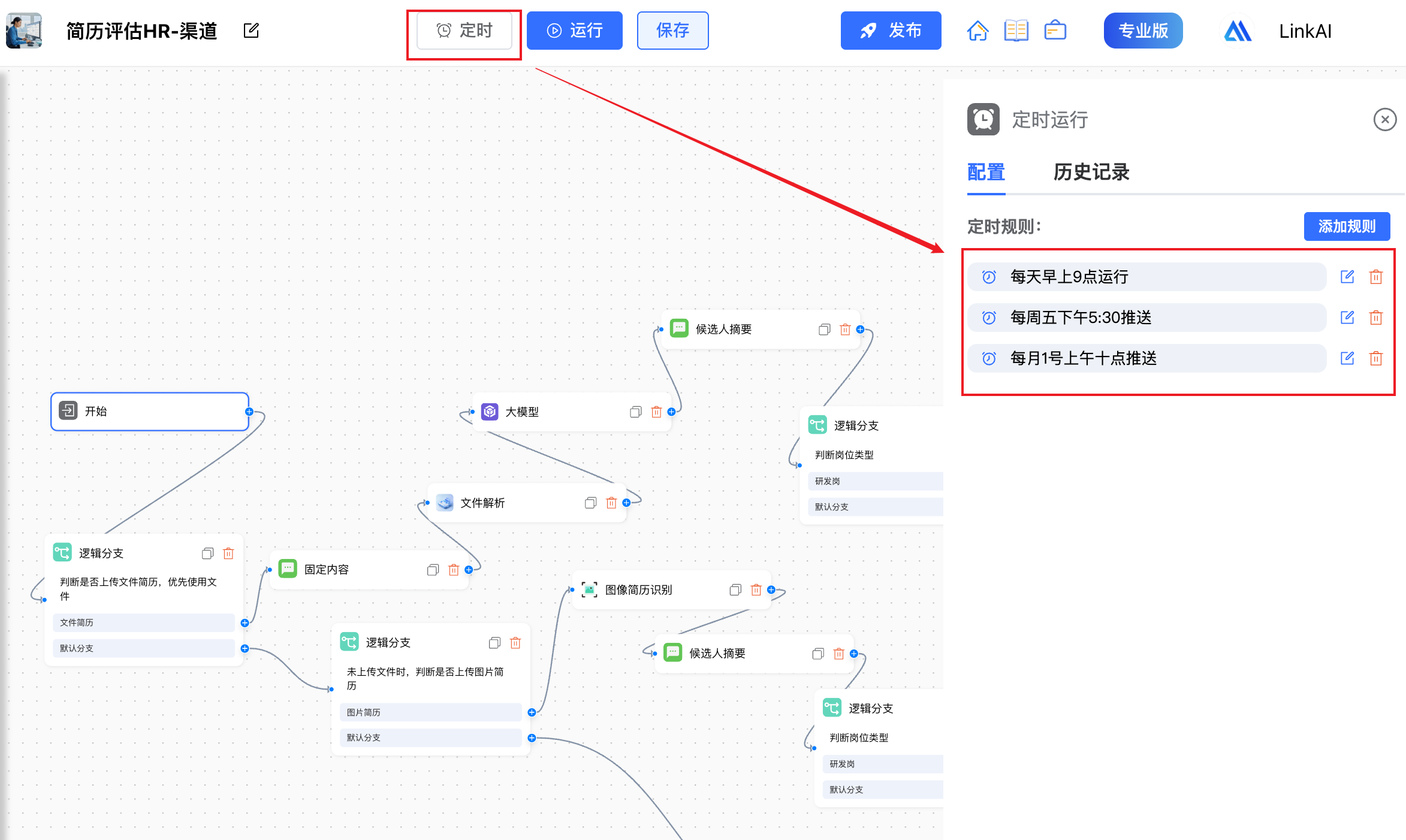 定时运行功能现在支持在一个工作流中配置多个定时规则,可以设置不同的执行时间和频率,满足复杂的自动化需求: