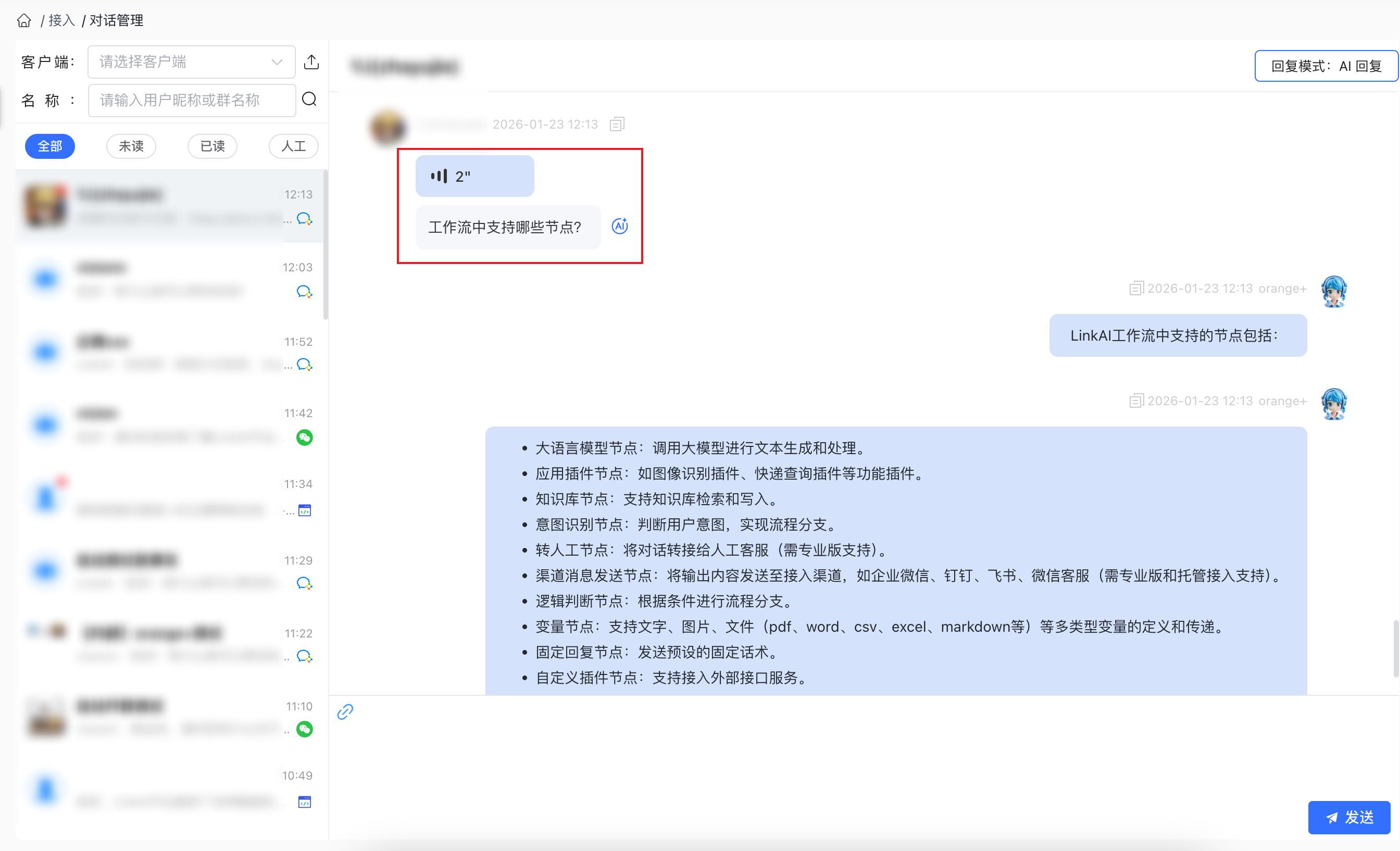 客户端配置中设置人工接入时支持展示公司信息,同时优化了人工介入时AI不回复的策略对渠道发送节点不生效的问题。