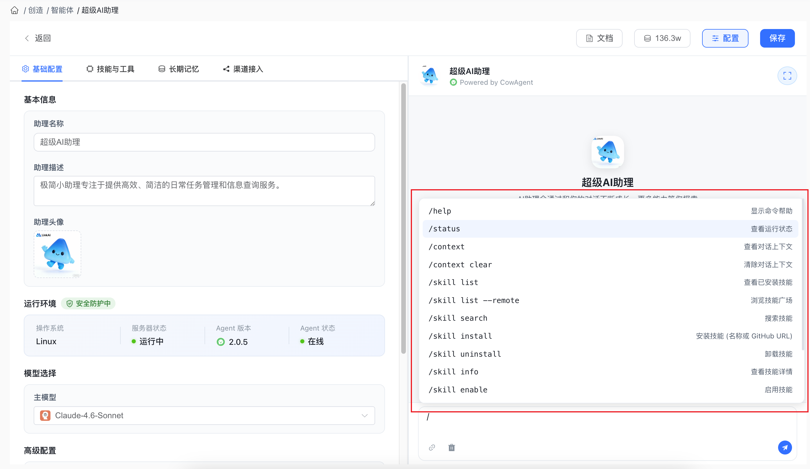 新增对话命令工具,支持在 web控制台和接入渠道 中通过指令实现对 Agent 的全方位管理,支持 /help、/status、/config、/skill、/context、/logs、/version 等