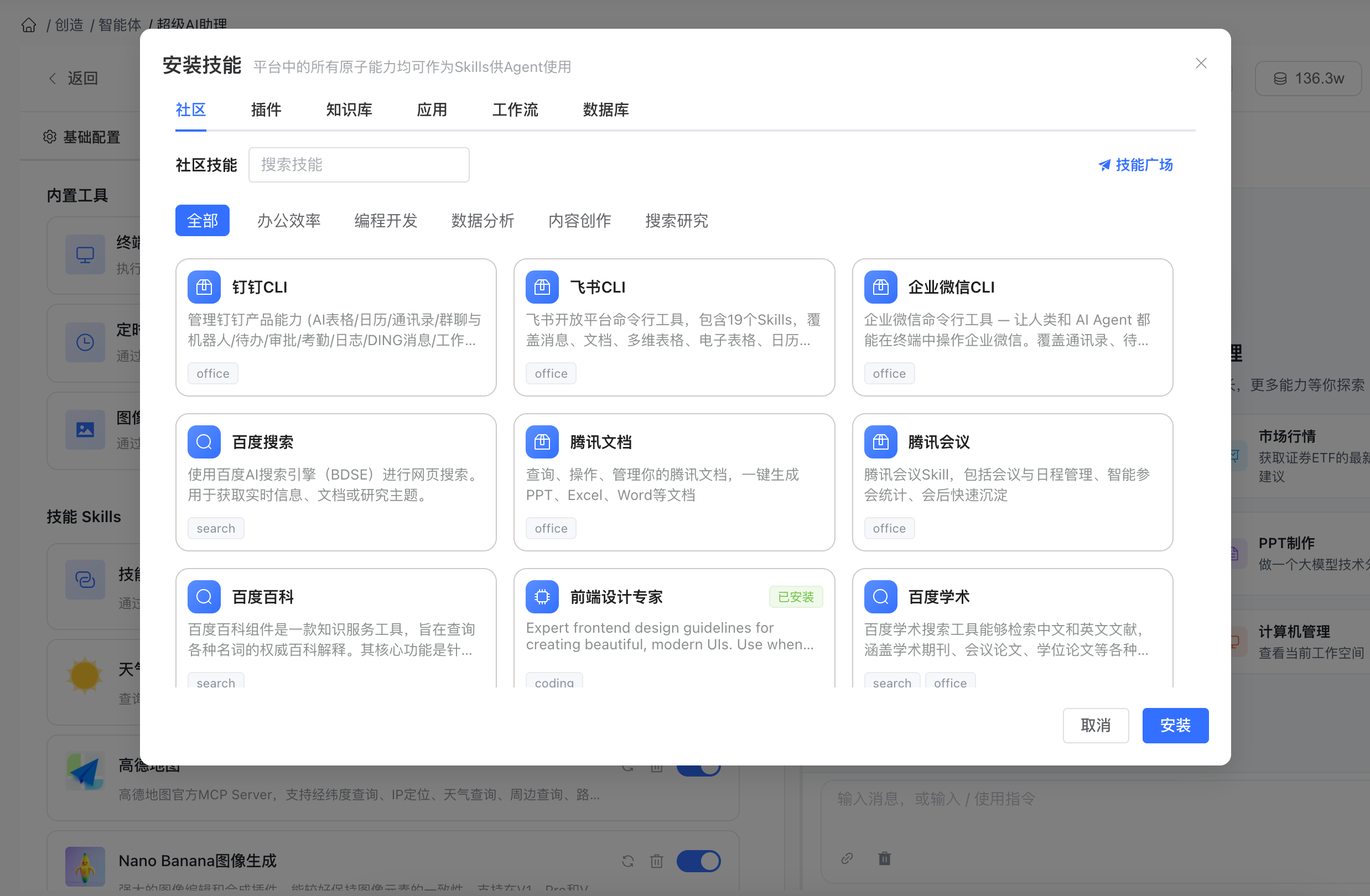 支持从 Skill Hub(技能广场)浏览、搜索和安装 AI Agent 技能,汇集精选技能、社区贡献技能和三方技能: