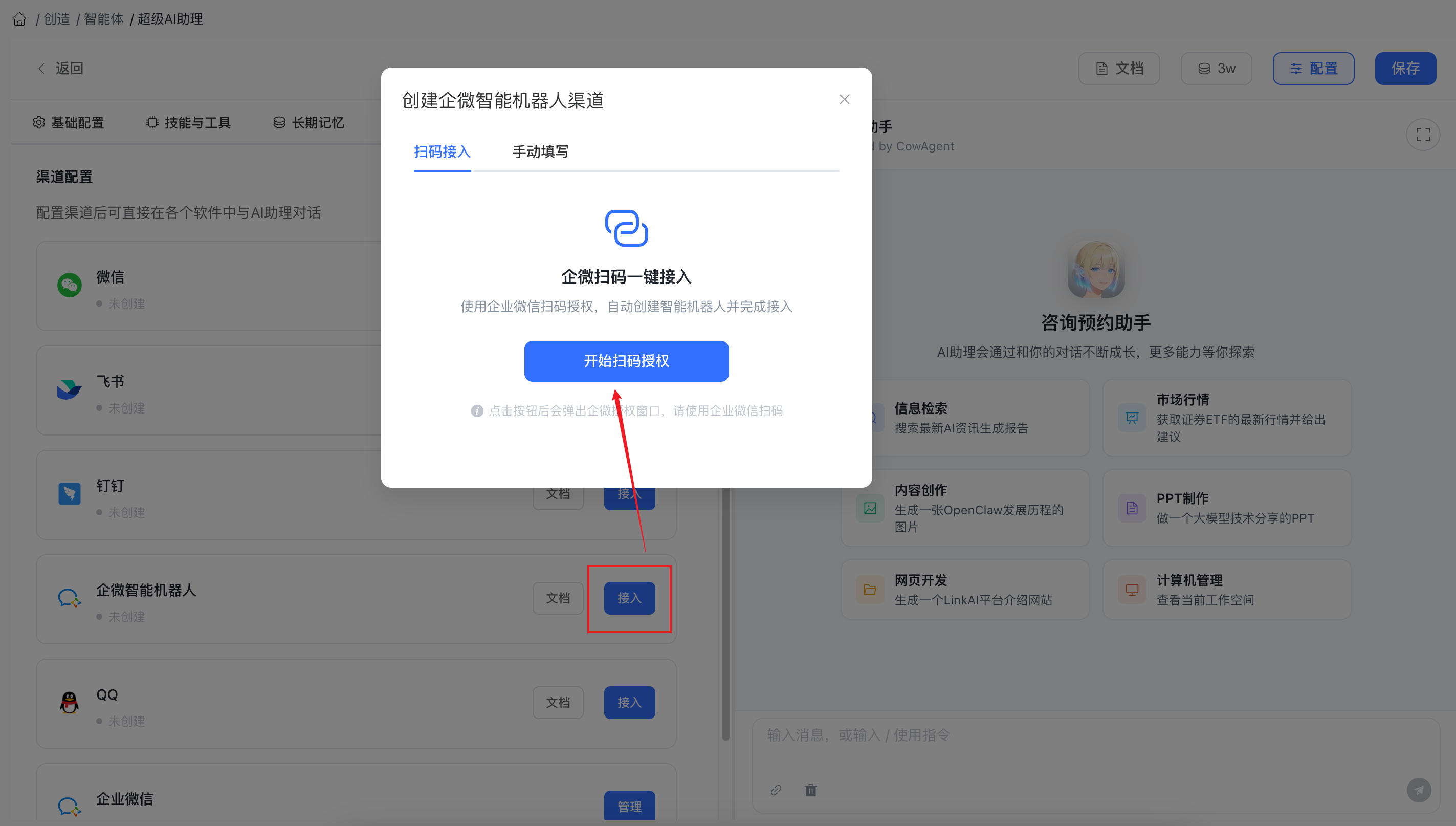 企业微信智能机器人 通道新增一键扫码接入功能:
