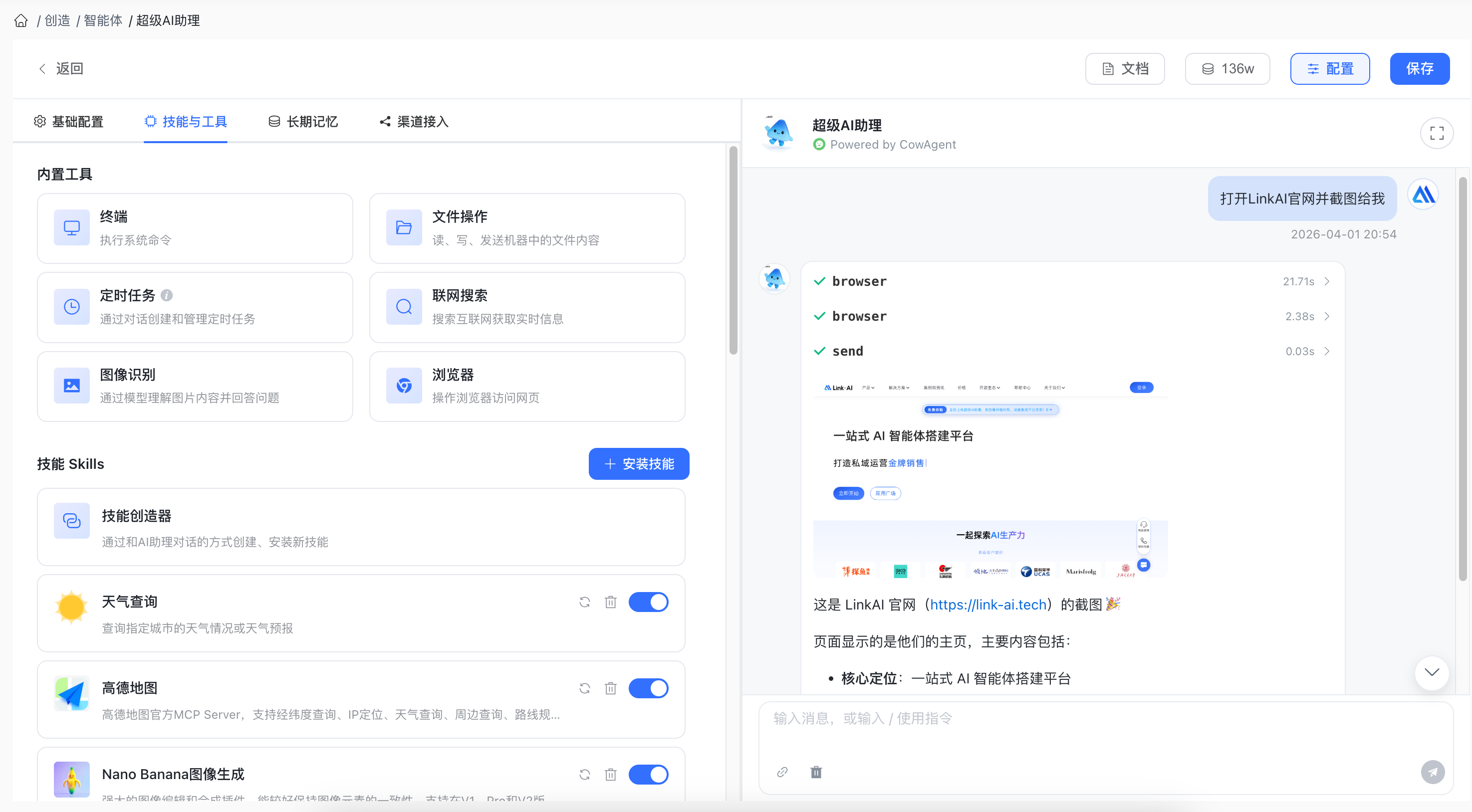 - 截图能力:支持页面截图保存到工作区并发送给用户
